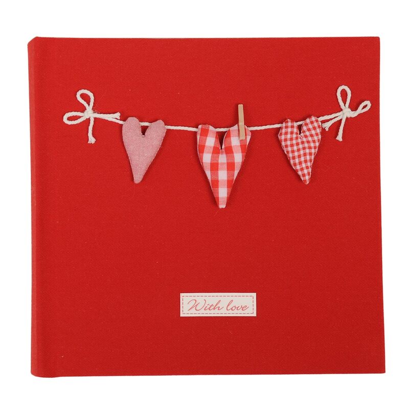 Fotoalbum v červenej farbe, s tromi zavesenými srdiečkami na šnúrke. Obal fotoalbumu je obalený v červenej látke. Vnútorné strany - fólie na 200 ks fotografie 10*15cm.