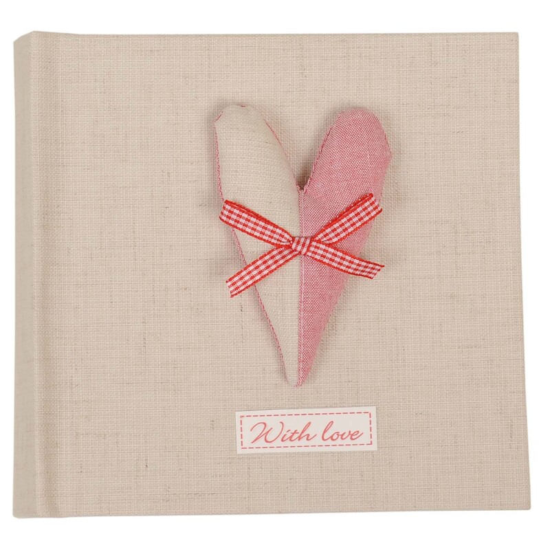 Fotoalbum v prírodnej farbe so srdiečkom. Fotoalbum je obalený v prírodnej látke. Vnútorné strany - fólie na fotografie 10*15cm.