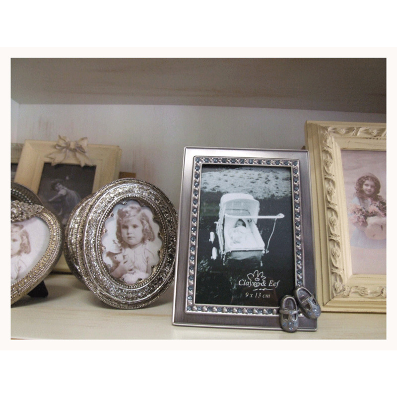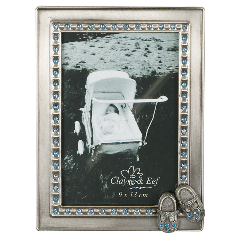 Kovový vintage fotorámik na fotku Vášho dieťatka, v rámiku sú aplikované malé modré kamienky a malé topánočky v pravom rohu.