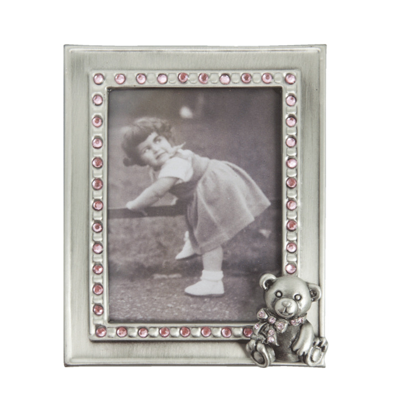 Strieborný fotorámik na detskú fotku s macíkom a ružovými kamienkami. Krásne zabalený v modrej papierovej krabičke.