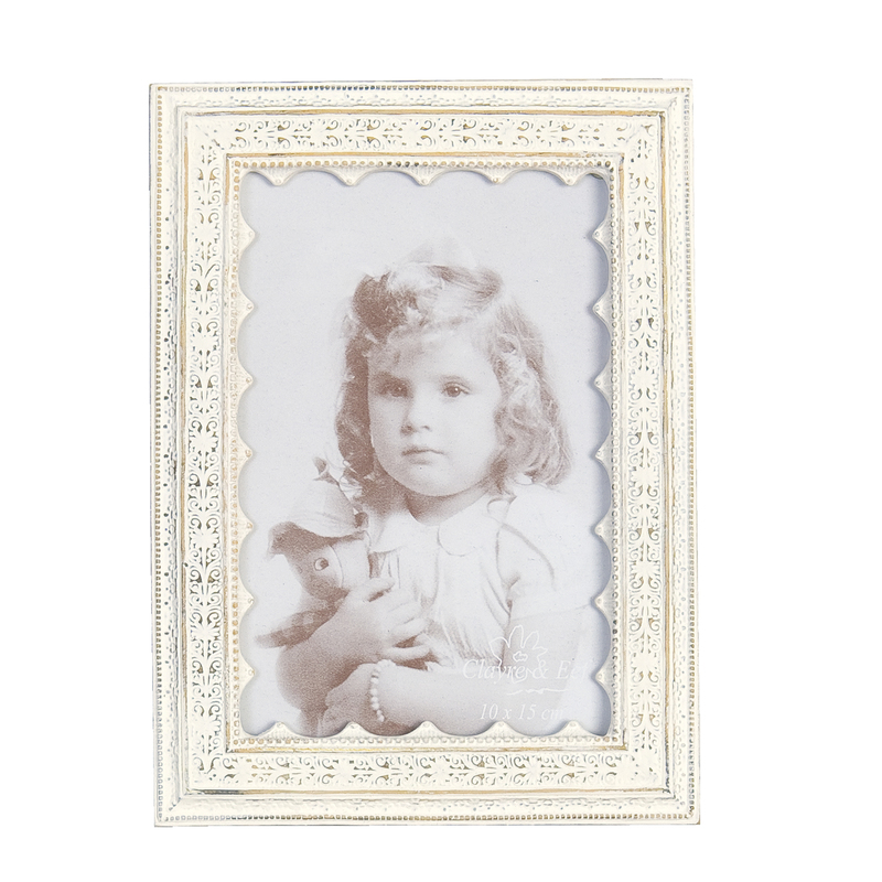 Biely fotorámik vo vintage štýle s jemným dekorom. Rozmer výrezu na fotku je 10 x 15 cm.