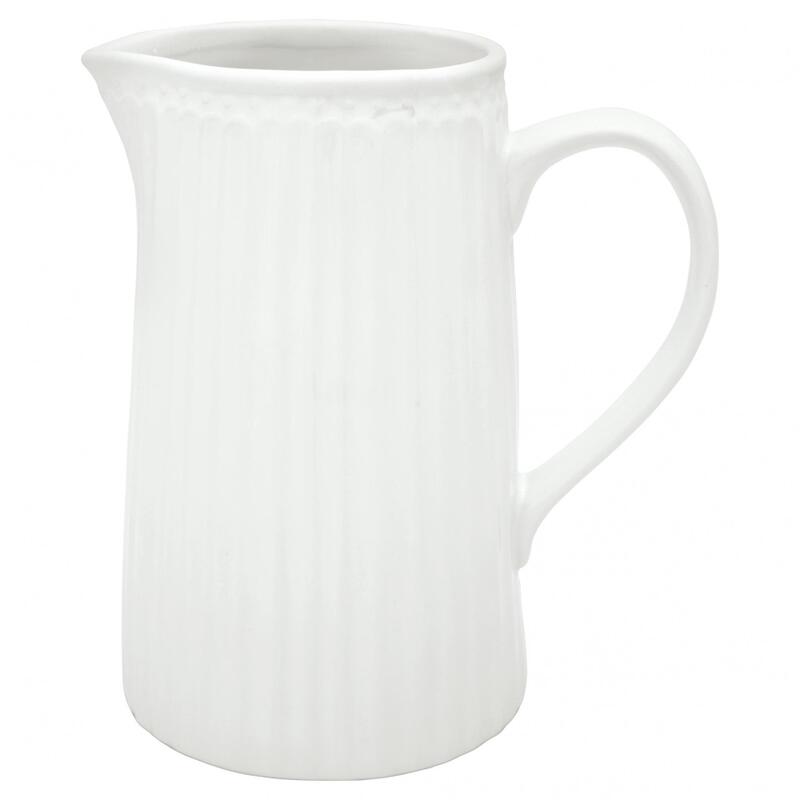 Krásny džbán Aliíce White od dánskej značky Green Gate. Je bielej farby s výraznými vrúbkami. Skvele sa hodí na limonády, vodu, čaj alebo mlieko či iné nápoje alebo ako váza. Výrobok je vhodný aj do umývačky riadu.