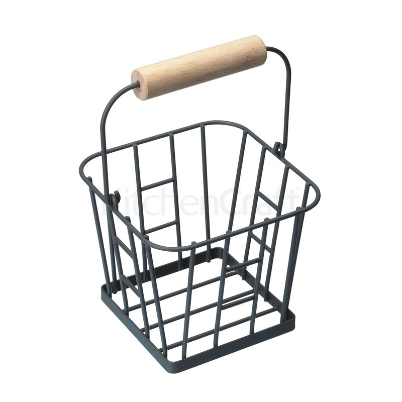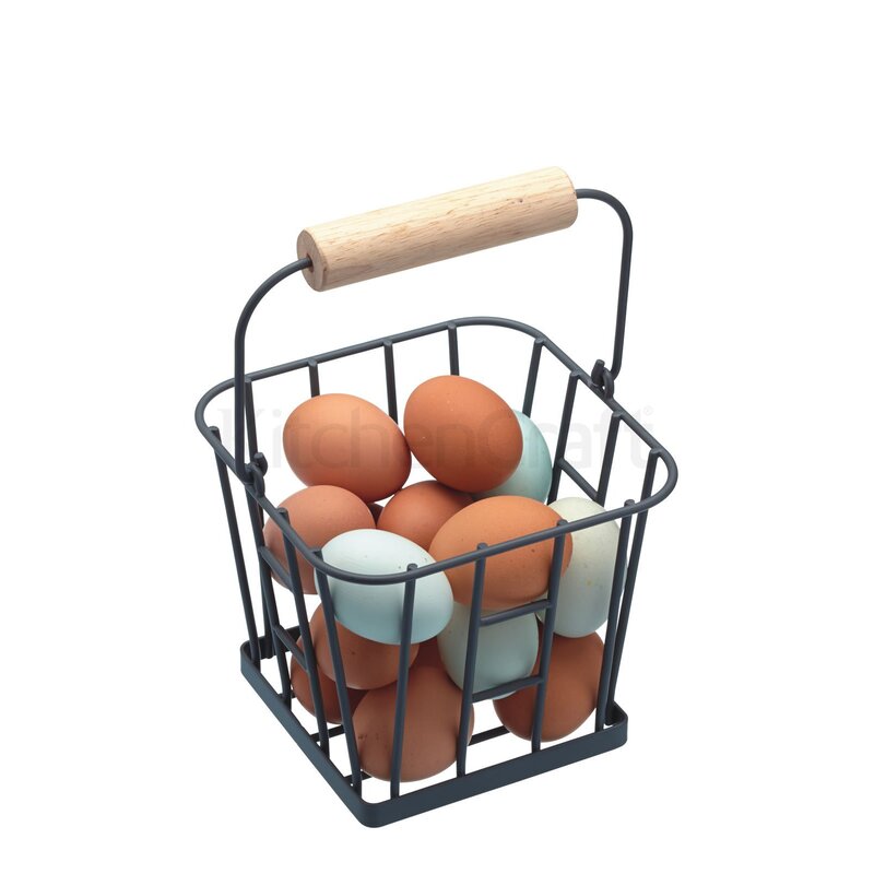 Moderný ale súčasne tradične pôsobiaci kovový košík, ktorý môžete použiť na uchovávanie vajíčok. Košík s drevenou rúčkou je košík v tmavej sivej farbe. Do košíka pohodlne vložíte približne 16 vajec.