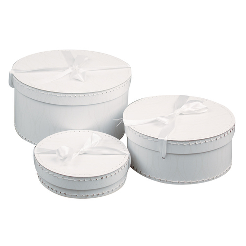 Úložné krabice z pevnej lepenky, cez veko je uviazaná biela saténová stuha. Rôzne veľkosti. Farba: žiarivo biela, jemné šedé vlnky, lesklý povrch. Krásny doplnok do Vášho interiéru.
