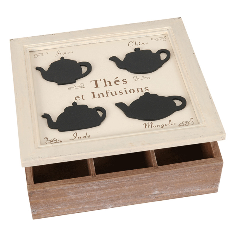 Drevená krabička na čajíky - vnútri má priečinky na rôzne druhy čajíkov - zvonka smotanovo biela so 4 čajníkmi. Farba: biela/čierna