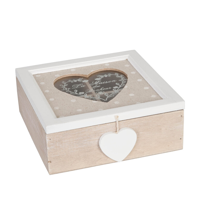 Drevená krabička na čaje s dekoračným srdiečkom.Vrchná časť je potiahnutá látkou so skleneným srdiečkom, na ktorom je francúzsky nápis.Má 4 priečinky na čaje.