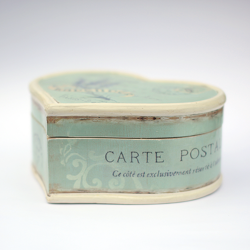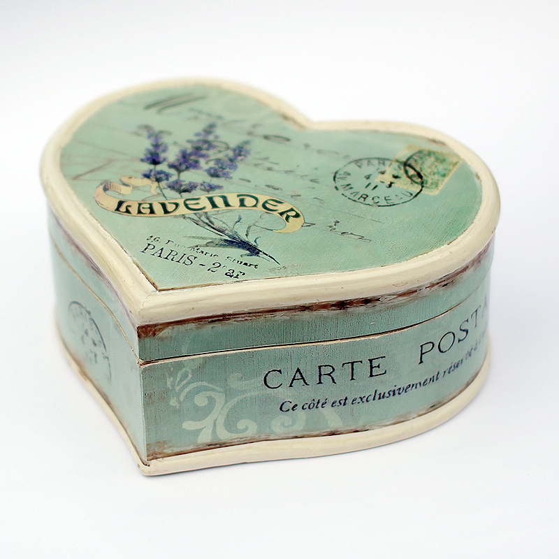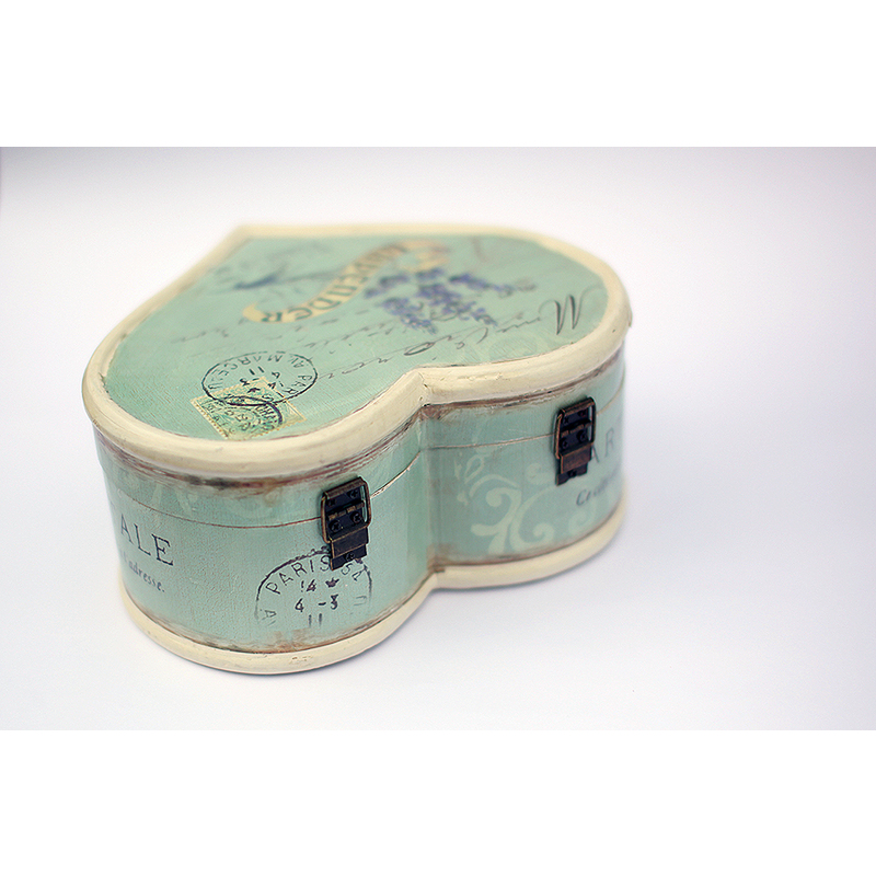 Krabička v tvare srdiečka s motívom levandule.Vnútro je potiahnuté látkou.Vhodná na šperky a i iné Vaše poklady.. Farba: modrá