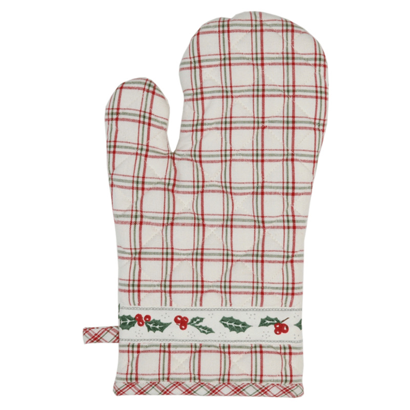 Chňapka - kuchynská rukavica biela s červeno-zeleným kockovaným vzorom.