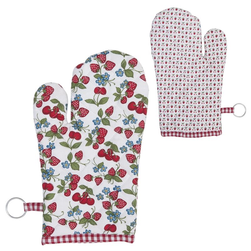 Kuchynská rukavica so vzorom jahôd, čerešní a nezabúdok, s kovovým krúžkom na praktické zavesenie.