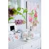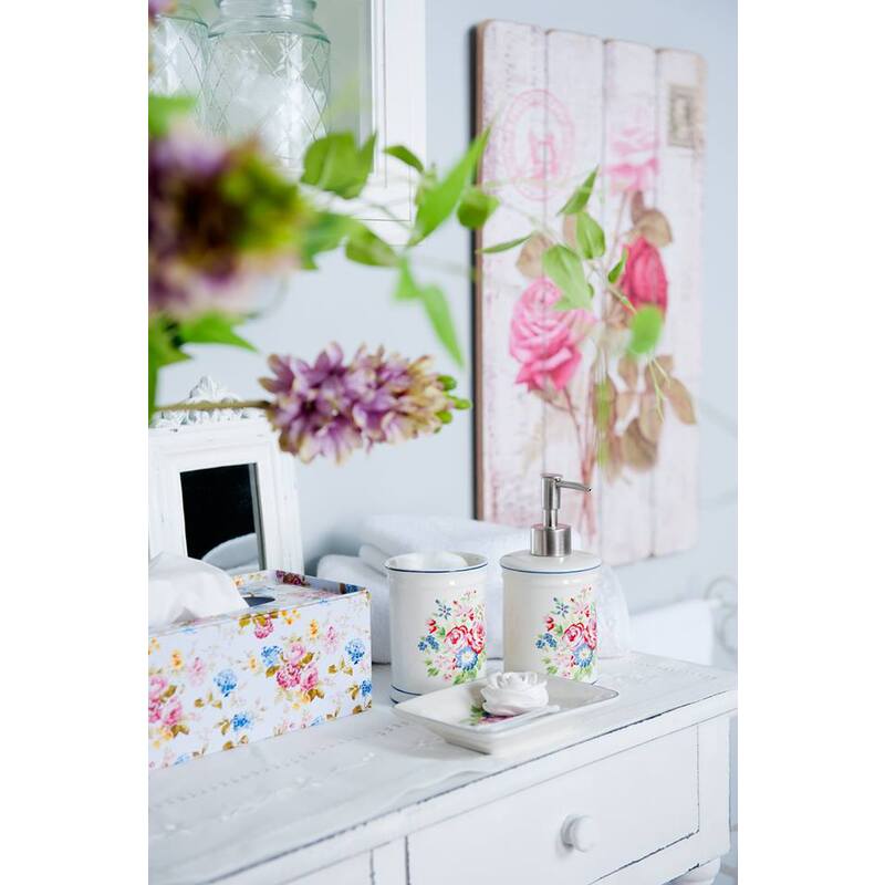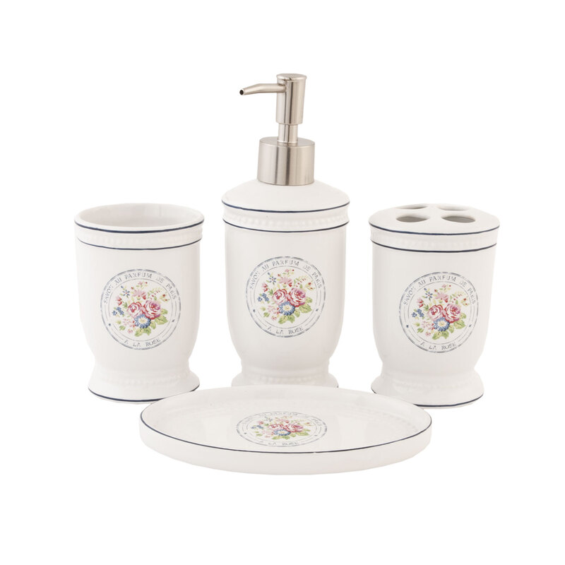 Kúpelňový keramický set do kúpelne, ktorý tvoria dózy na tekuté mydlo, kefky a pohár a misku na mydlo. Biely podklad s jemnými modrými pruhmi a kvietkovaným vzorom.
