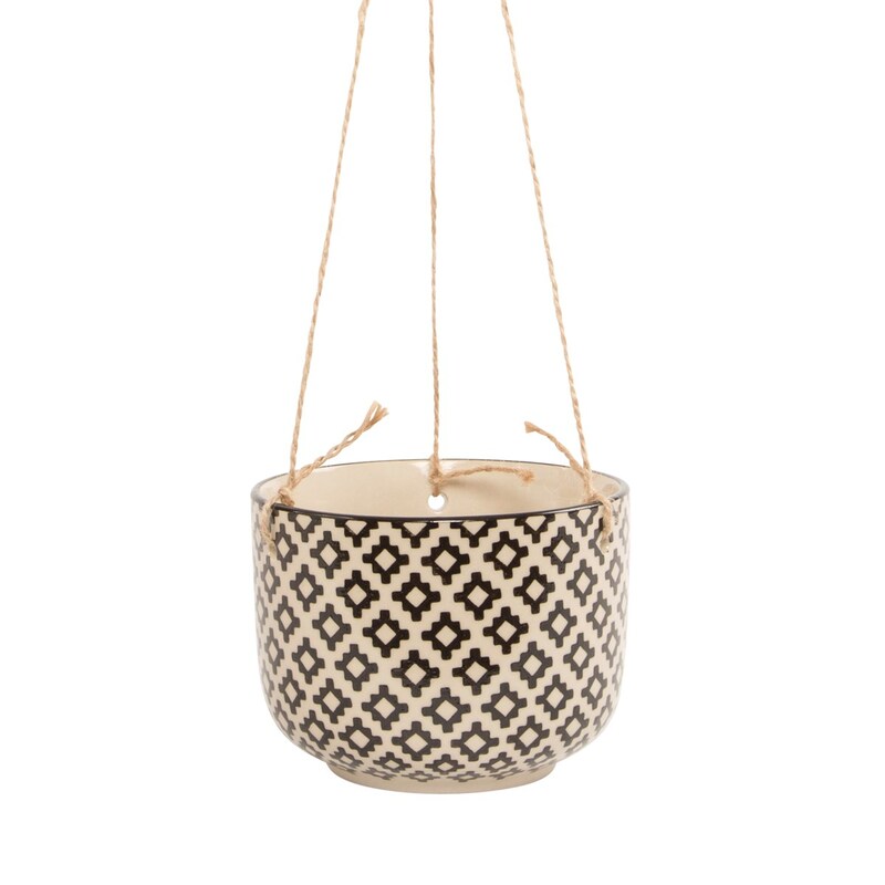 Závesné kvetináče slávia svoj návrat. Čistý geometrický vzor a kombinácia čiernej a béžovej farby krásne vynikne spolu so zelenými listami Vašej obľúbenej izbovej kvetiny.