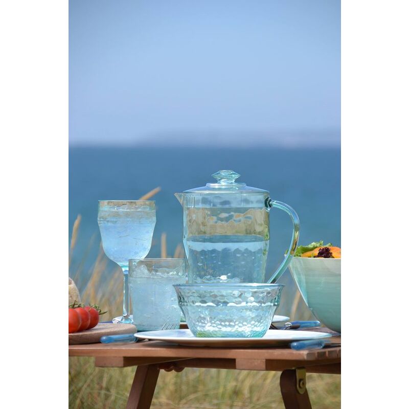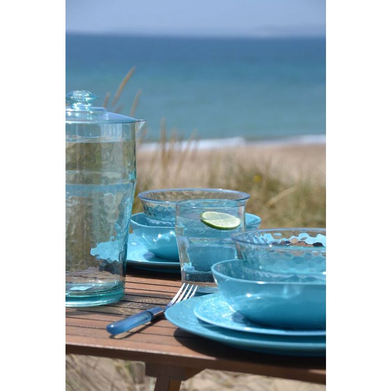Dezertná miska kolekcie "Atlantic" je vhodná na stolovanie na záhrade, terase alebo na piknik. Je vyrobená z umelej hmoty, ale navrhli ju tak, aby mala efekt recyklovaného skla. Misa má jemný dizajn a modrý odtieň. Je prakticky nerozbitná a preto je vhodná na vonkajšie stolovanie.