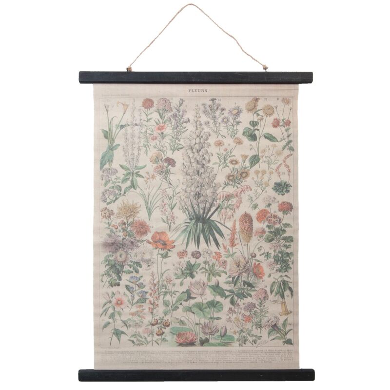 Krásny textilný obraz s potlačou byliniek a lúčnych kvetov v drevenom ráme.