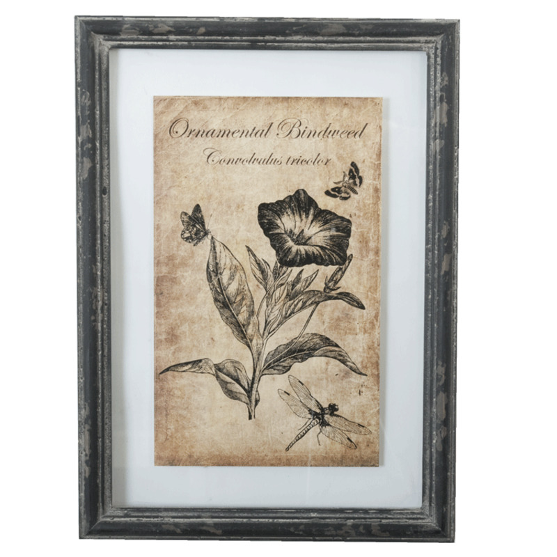 Obrázok kvetu zarámovaný v skle. Sklo je osadené v čiernom ráme s patinou.
