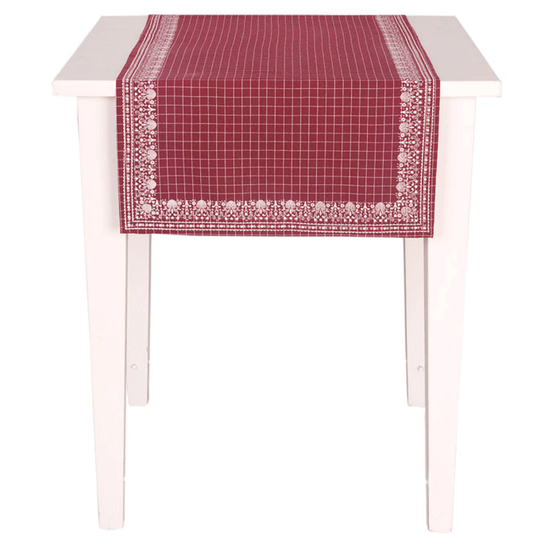 Obrus - štóla v červenej farbe, kockovaný vzor, po obvode je jemný biely ornament. Farba: tmavočervená zľava 30%, ušetríte 5,10 EUR