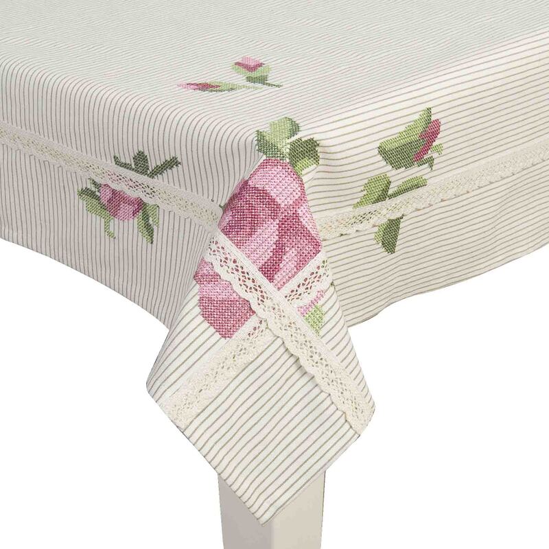 Obrus z kolekcie "Elegantná ruža" s aplikáciou vyšitej ruže a bavlnenou krajkou.