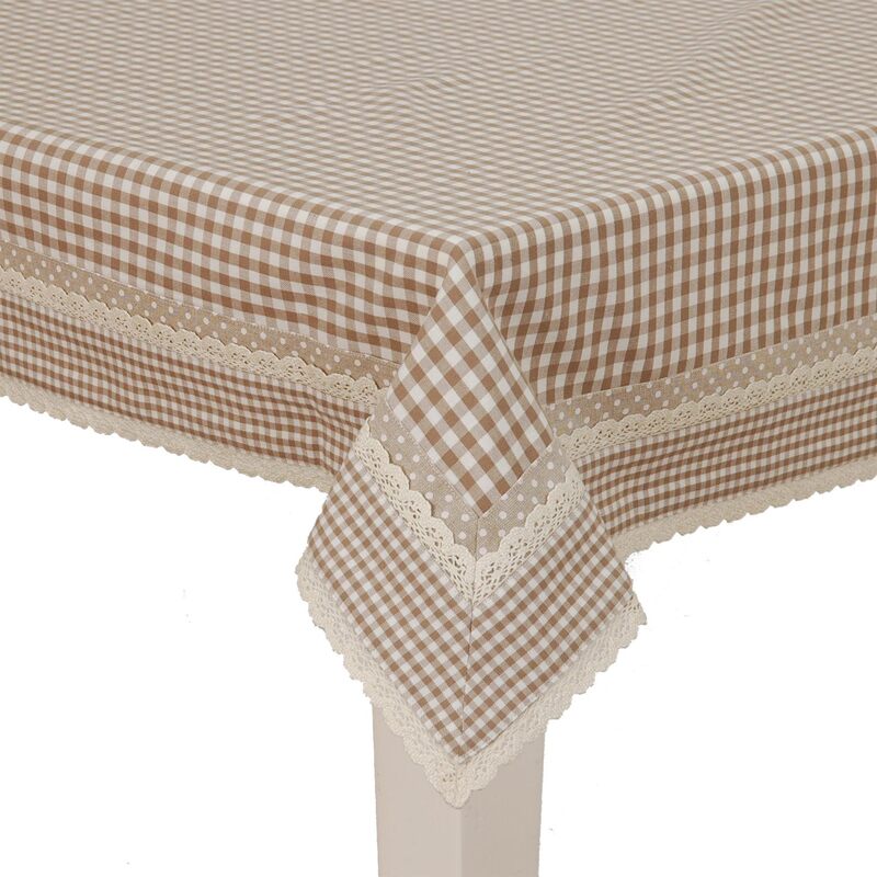 Krásny obrus s károvaným vzorom s jemnou krajkou po obvode obrusu.
