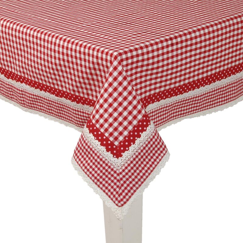 Nádherný obrus z kalitnej bavlny s károvaným vzorom a s jemnou bavlnenou krajkou v prírodnej farbe po obvode obrusu. Káro je doplnené bodkovaným lemom.