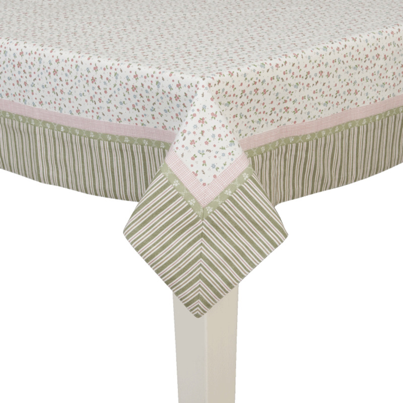 Bavlnený obrus s jemnými kvietkami a zeleným lemom. Zľava-20%.