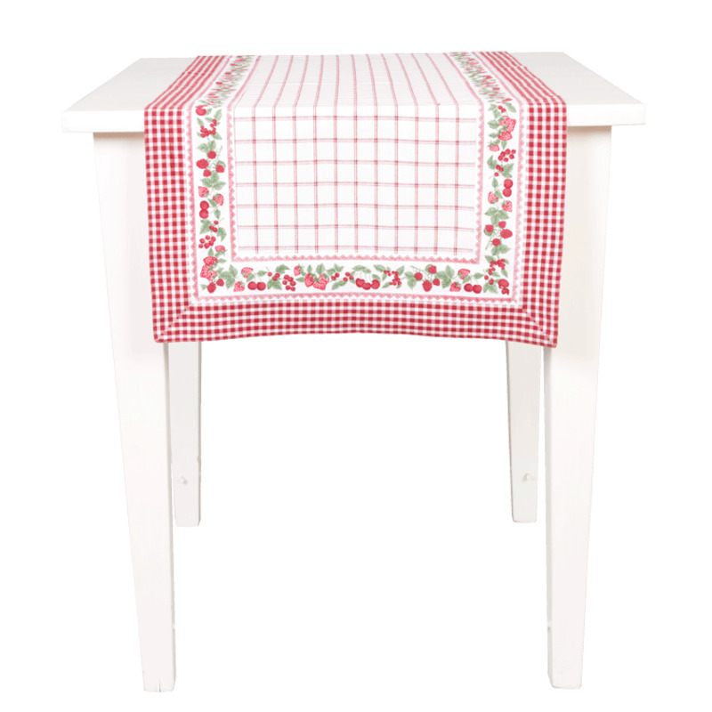 Obrus - štóla zo sladkej kolekcie "domáci lekvár" - biely s červenými kockami a potlačou drobného ovocia.