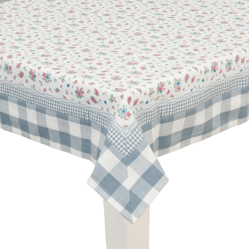 Bavlnený obrus s kvietkovaným vzorom - jemné modré a červené kvietky a s modrým kockovaným lemom.
