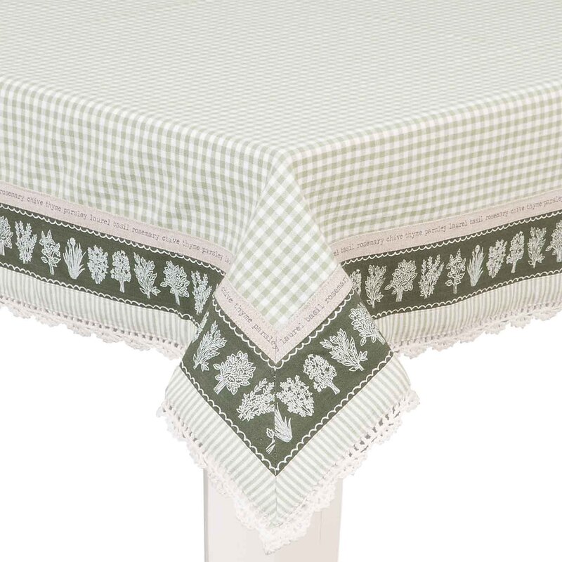 Bavlnený obrus z kolekcie "moja bylinková záhrada" - podklad tvorí bielozelená kocka, lemovaný krajkou so vzorom byliniek.