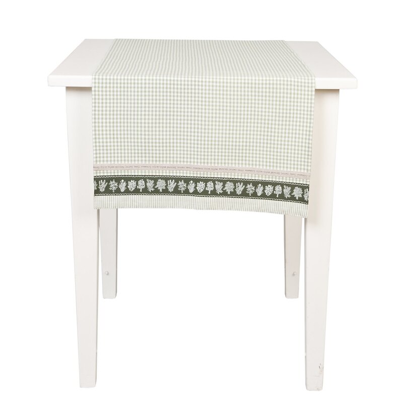 Obrus - štóla, z kolekcie "moja bylinková záhrada". Jemný kockovaný vzor - lem so vzorom byliniek. Farba: sivá/biela/zelená