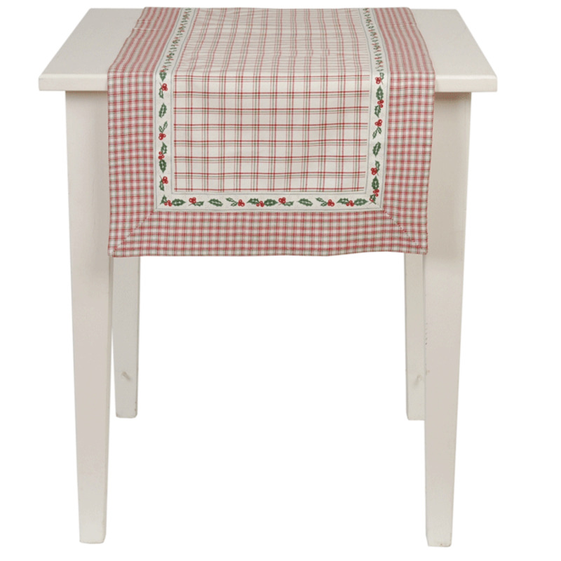 Obrus - štóla, červeno-zelený kockovaný vzor, lem s kvietkami.