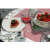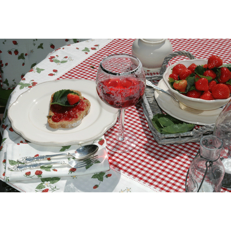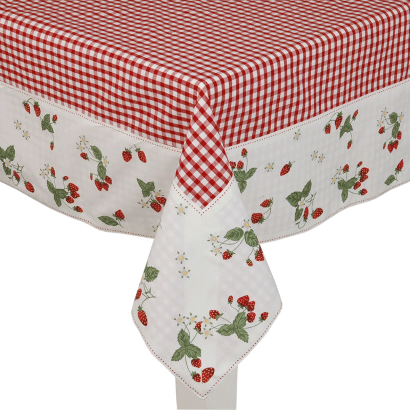 Bavlnený obrus "jahodová záhrada" - červený kockovaný s bielym lemom so vzorom jahôd. Zľava -20%.