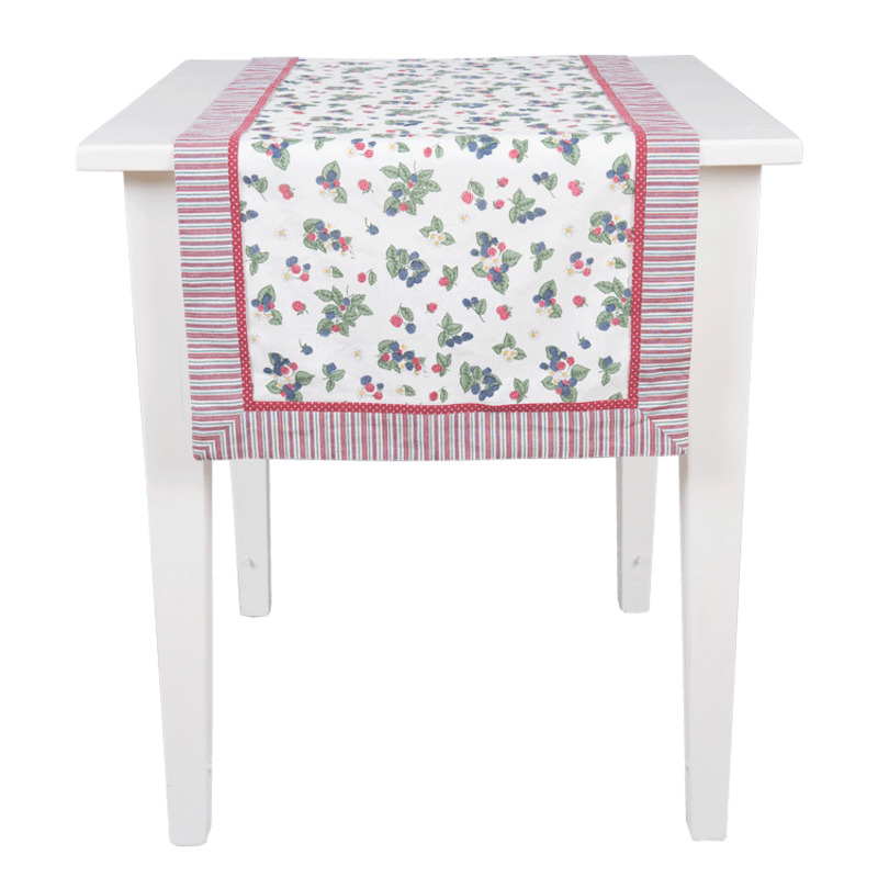 Obrus - štóla s potlačou černíc, červená pruhovaná obruba. Farba: biela/červená/modrá Zľava -20%.