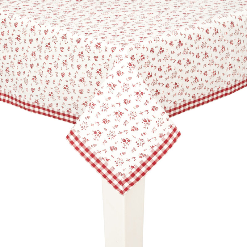 Bavlnený obrus s bielym podkladom a jemnými červenými kvietkami a kockovaným lemom.