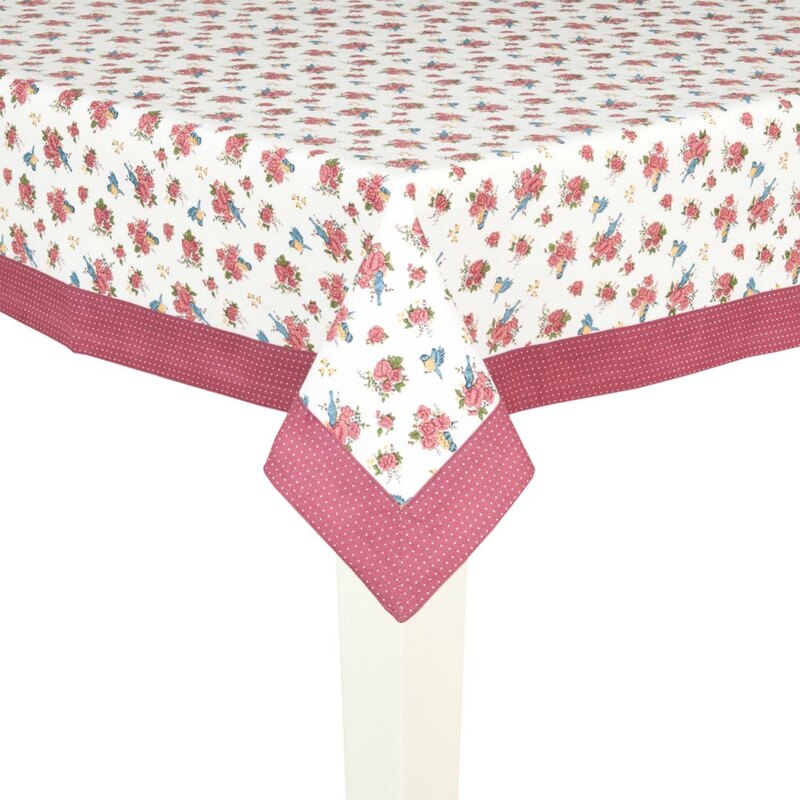 Bavlnený obrus s jemným vzorom kvetov a vtáčikov a červeným lemom s bielymi bodkami.