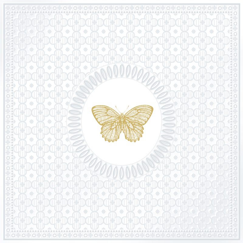 Dizajnové, embosované (tzn. potlačené ornamenty) obrúsky/servítky v znovu uzatvárateľnom obale s potlačou zlatého motýľa v strede. Trojvrstvové, tlačené ekologickými farbami. Papierové obrúsky sú vhodné na váš sviatočný stôl. Balenie obsahuje 15 kusov.