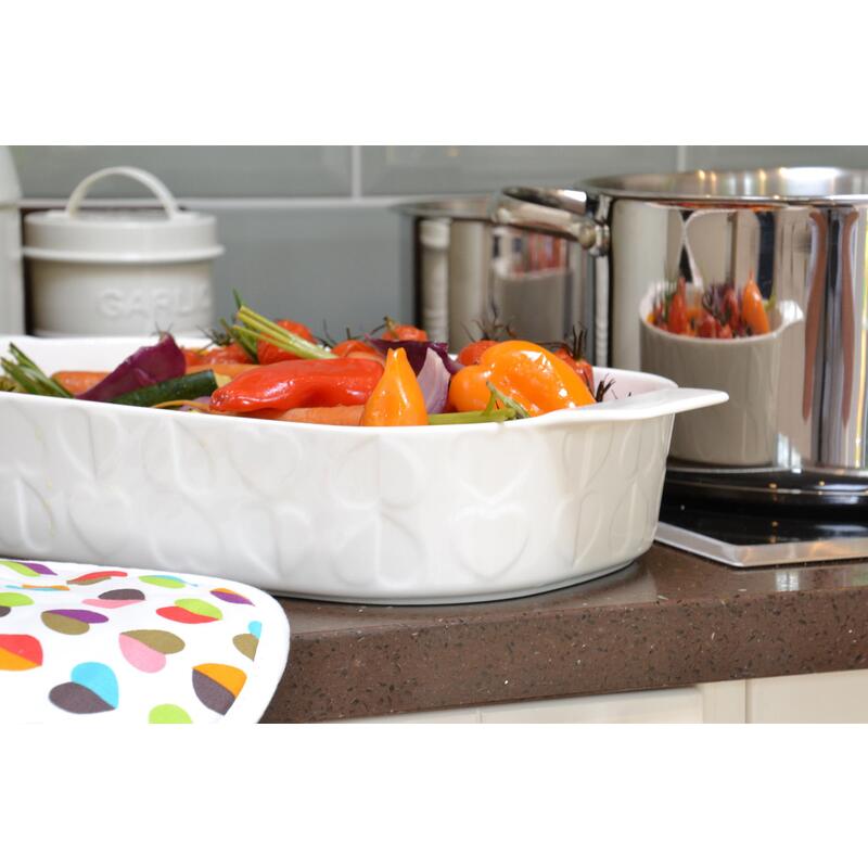 Keramický pekáč v bielej farbe s jemným dizajnom odtlačených bielych srdiečkových listov. Pekáč biely sa hodí do modernej ale i vidieckej kuchyne. Môžete ho použiť na pečenie koláčov, alebo zapekanie zeleniny, zemiakov... Je to i skvelý darček do novej kuchyne alebo pre šikovné kuchárky.