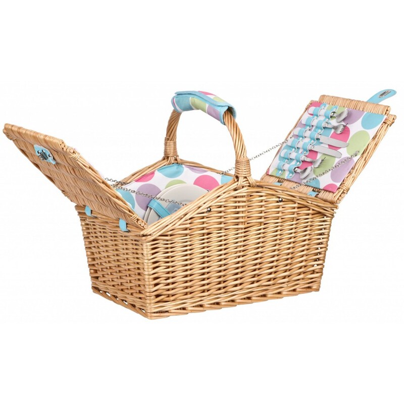 Krásny prútený kôš v prírodnej farbe, pre 4 osoby,skvelý pre víkendový piknik v parku alebo na lúke. Set obsahuje:4 bavlnené obrúsky v bledomodrej farbe, 4 sklenené poháre na stopke, 4 keramické taniere, set 4 nožov, vidličiek a lyžičiek.Poťah je bodkovaná polyesterová látka v pastelových farbách. Navrhnuté dizajnérmi Veľkej Británie. Zľava -20%.
