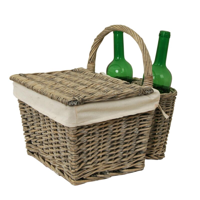Prútený piknikový košík - vnútro obtiahnuté látkou prírodnej farby, s košíčkami na 2 fľaše.