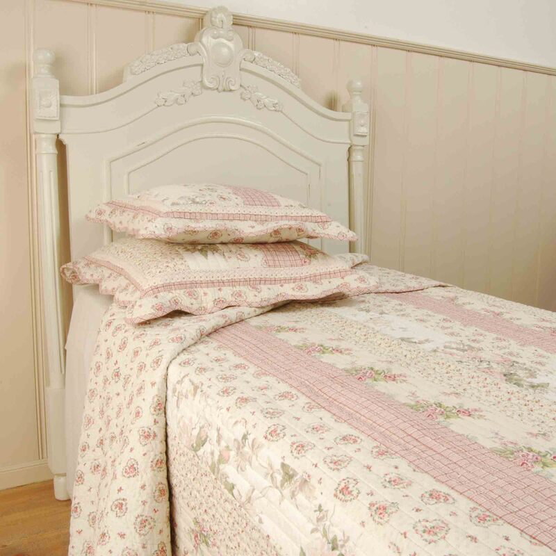 Romantická prešívaná patchworková prikrývka na posteľ so vzorom jemných kvetov a s aplikáciou bavlnenej krajky. Farba: ružová,biela