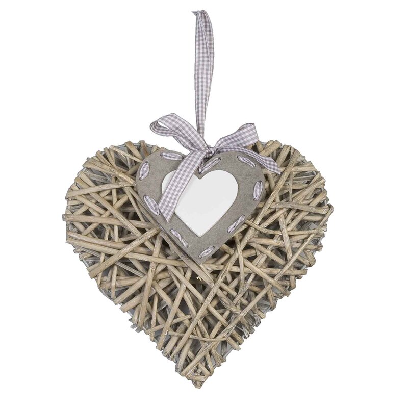 Prútené srdce s malým dreveným bielym srdiečkom, zavesené na károvanej dekoračnej stužke. Farba:sivá /patinovaná povrchová úprava. Ideálny doplnok do vášho bytu.