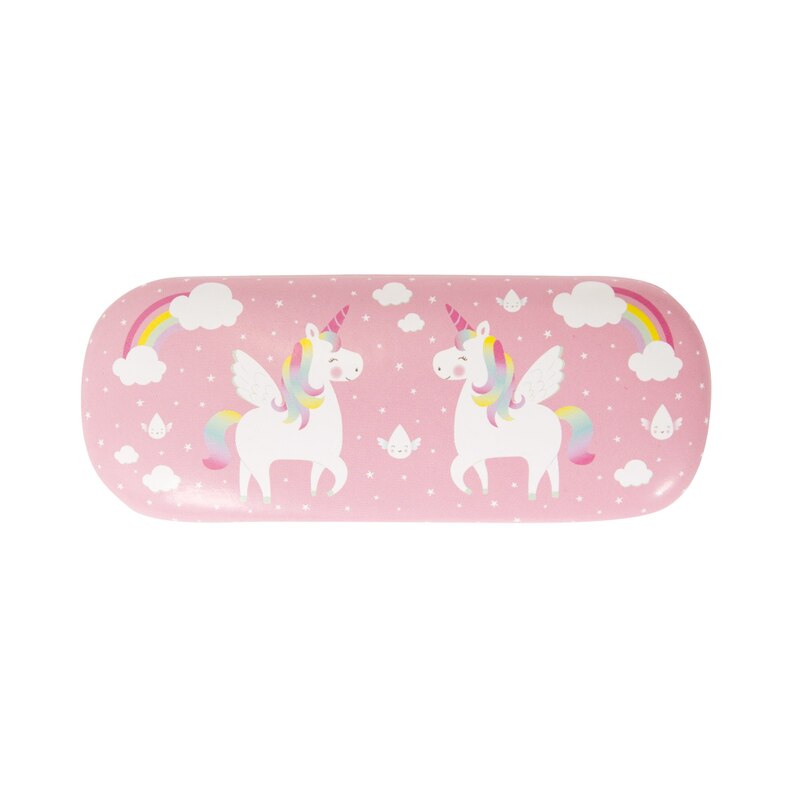 Puzdro na okuliare s obrázkom jednorožca v pastelových farbách. Puzdro obsahuje i textilnú handričku na čistenie okuliarov.