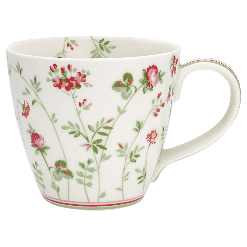 Jemné ďatelinkové kvety krásne vynikajú na bielej porcelánovej šálke s uškom od dánskej značky Green Gate. Lahodne si z nej vychutnáte čaj, kávu alebo čokoládu. Je vhodná do umývačky riadu aj do mikrovlnnej rúry.
