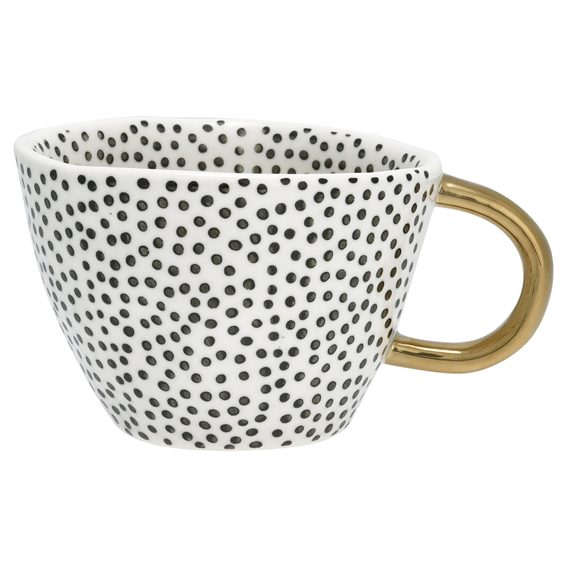Užite si svoju kávičku alebo čaj z tejto krásnej šálky s nadčasovým dizajnom - drobné čierne bodky na bielom podklade a krásny detail zlatého uška vám dodá pocit elegancie. Výrobok nie je vhodný do umývačky riadu ani do mikrovlnnej rúry.