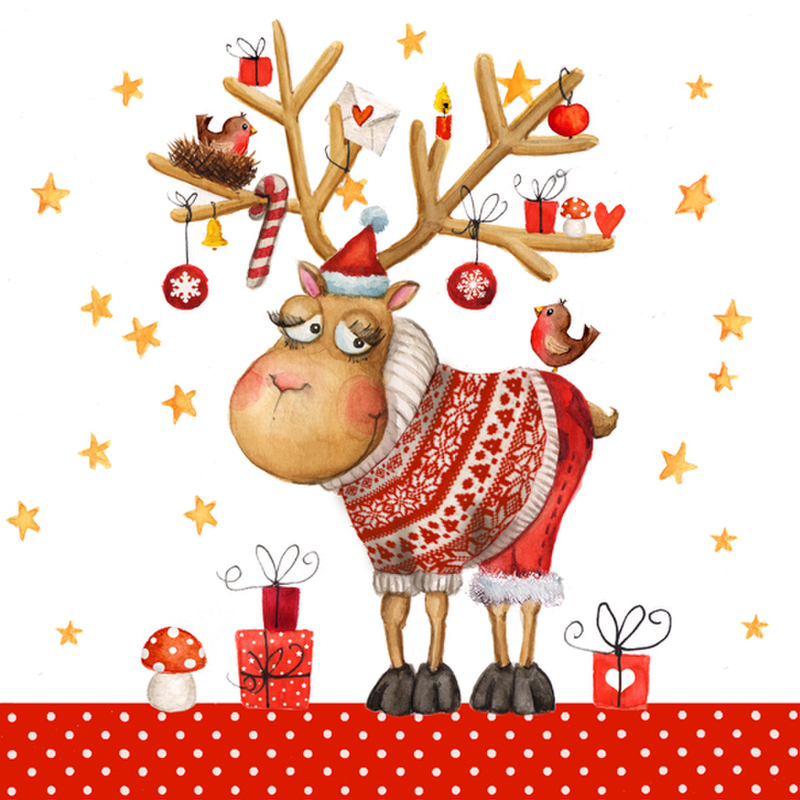 Servítky - s obrázkom vianočného soba - 3-vrstvové, balenie obsahuje 20 ks servítkov. Výrobok je označený značkou FSC- značka zodpovedného lesného hospodárstva, t.j. je vyrobený z FSC certifikovaného materiálu a/alebo recyklovaného materiálu a/alebo spoločnosťou kontrolovaných zdrojov