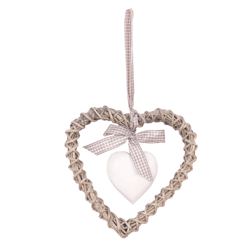 Prútené srdiečko s malým bielym zaveseným srdiečkom a kockovanou stužkou.