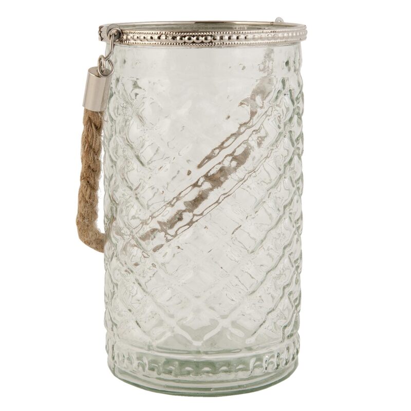 Sklenený "vintage" svietnik so striebornou kovovou obrubou a s rúčkou z motúza. Môže slúžiť i ako váza.