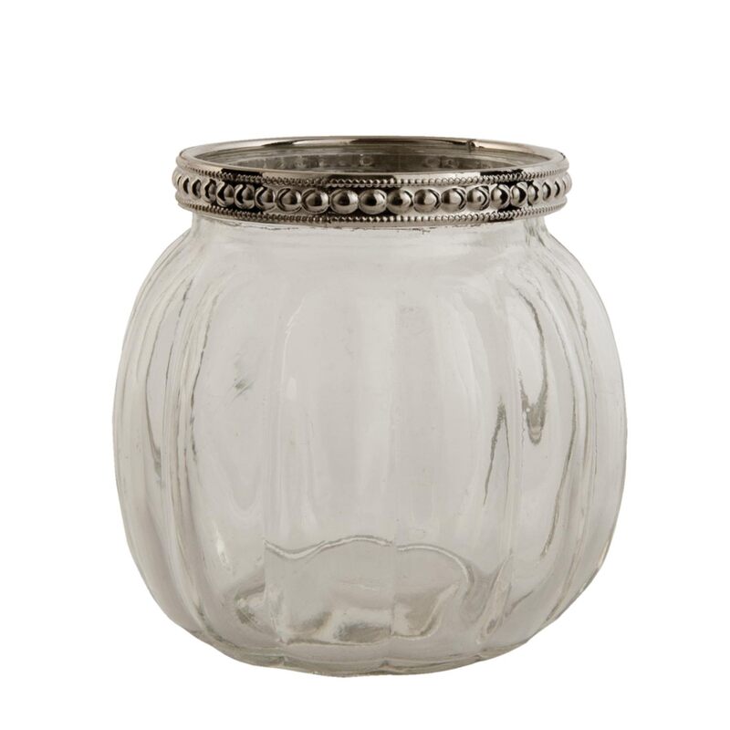 Sklenený "vintage" svietnik so striebornou kovovou obrubou a s rúčkou z motúza. Môže slúžiť i ako vázička.
