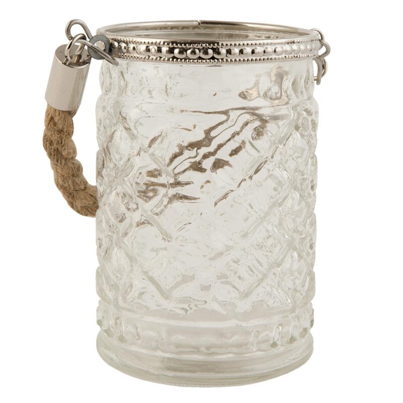 Sklenený transparentný svietnik na čajovú sviečku so strieborným lemovaním a uškom z prírodného motúzu. Pekne doplní Vaše zátišia.