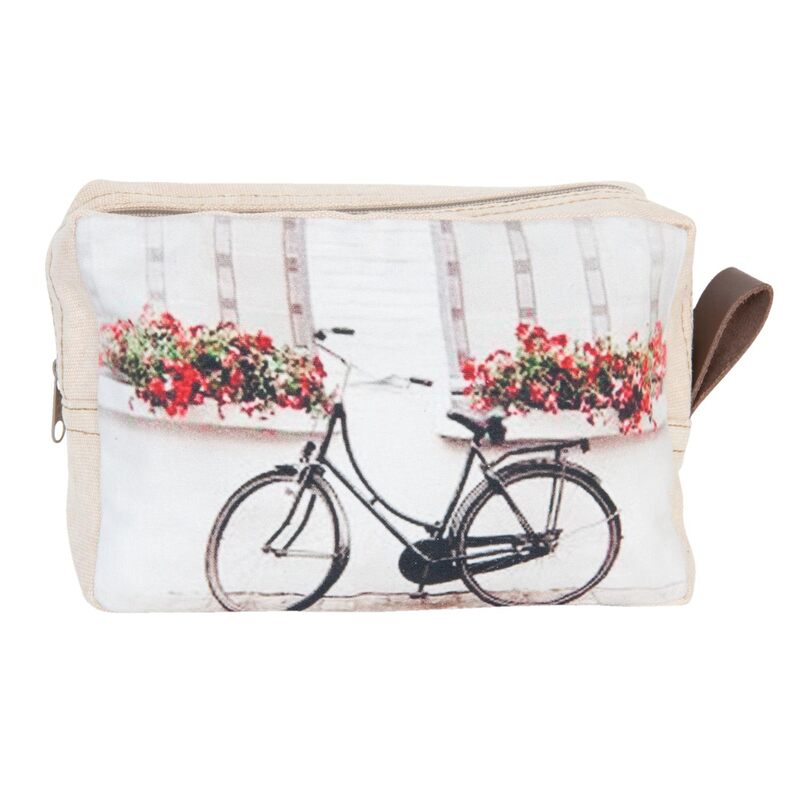Textilná taštička - na kozmetiku alebo pracovné potreby - s obrázkom bicykla. Uzatvára sa na zips a má uško na zavesenie.