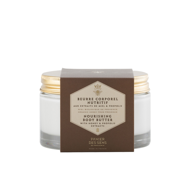 Telové maslo s medom a propolisom, vzácnymi substanciami vyrobenými včelami. Propolis kombinuje svoje antiseptické vlastnosti s antioxidačnou silou. Tieto úžasné vlastnosti v kombinácii so zmäkčujúcim medom a vyživujúcim bambuckým maslom vytvára upokojujúci riutál starostlivosti o pokožku celého Vášho tela. Môžete aplikovať na celé telo, najmä na suchú pokožku. Maslo zanecháva pokožku jemnú, vláčnu a príjemne voňajúcu. Buďte očarení ultra-výživnou silou tohto masla s vôňou medu a jemných kvetov mandlí a santalového dreva.