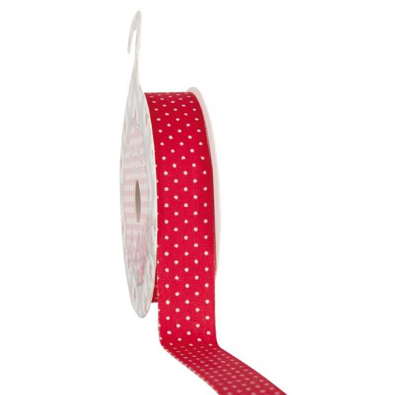 Dekoračná textilná lepiaca washi páska - textilná - červená s bielymi bodkami. Kotúčik má 4 metre a šírku 15 mm.