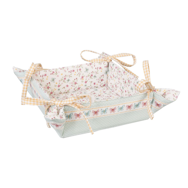 Textilný košík z kolekcie "leť ako motýľ" s jemným vzorom drobných kvetov a motýľov. Zaväzovanie na šnúrky, tvrdá výstuž. Možnosť prať v práčke.